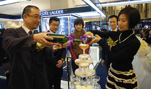 雙方領(lǐng)導共同為慶祝雅詩(shī)蘭黛盛裝入駐蘭州國芳百貨倒入香檳