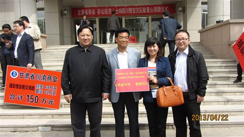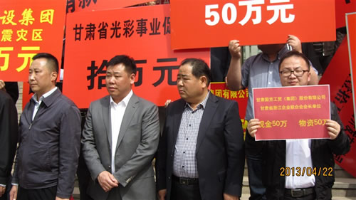 2013年4月22日下午15時(shí),在甘肅省政協(xié)一樓,由甘肅省委常委、省委統戰部部長(cháng)澤巴足,省委統戰部副部長(cháng)、甘肅省工商聯(lián)黨組書(shū)記、第一副主席吳繼德等相關(guān)領(lǐng)導出席了“甘肅省商會(huì )非公經(jīng)濟人士向四川雅安災區獻愛(ài)心捐贈儀式”。捐贈現場(chǎng)眾多甘肅省非公企業(yè)向4月20日雅安市地震災區進(jìn)行了捐贈,廣大愛(ài)心企業(yè)和人士用自己的實(shí)際行動(dòng)對災區同胞奉獻了自己的真情和祝福。