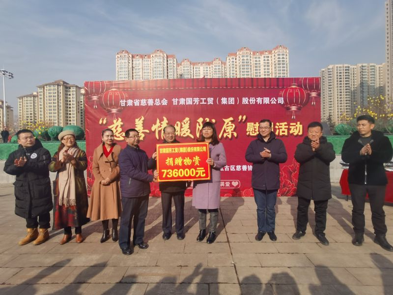 2020年1月14日,甘肅省慈善總會(huì )、蘭州市慈善會(huì )以及紅古區民政局攜甘肅國芳工貿(集團)股份有限公司在蘭州市紅古區海石廣場(chǎng)共同舉行“慈善情暖隴原”暨物資捐贈活動(dòng),將2000件棉衣,1200余件秋褲,2000余件保溫杯以及1000余件棉拖合計價(jià)值73.6萬(wàn)元的過(guò)冬物資帶給蘭州市紅古區的困難群眾。