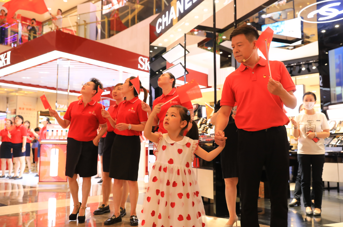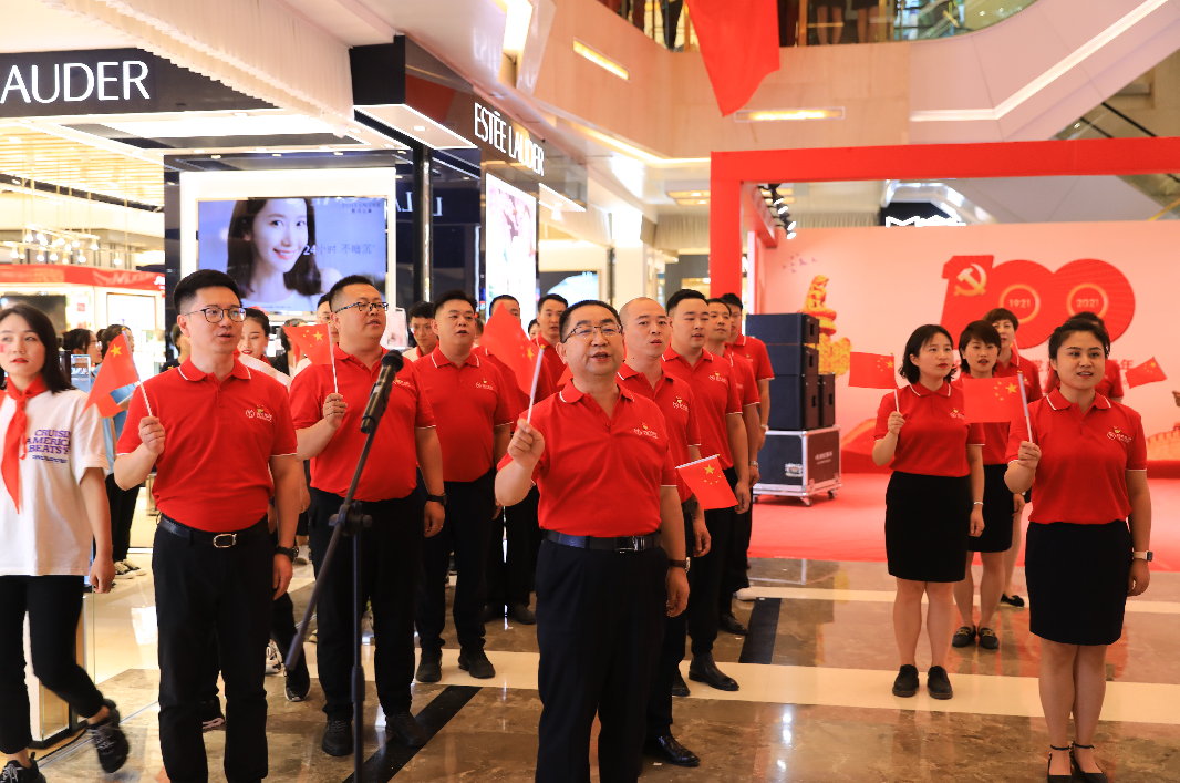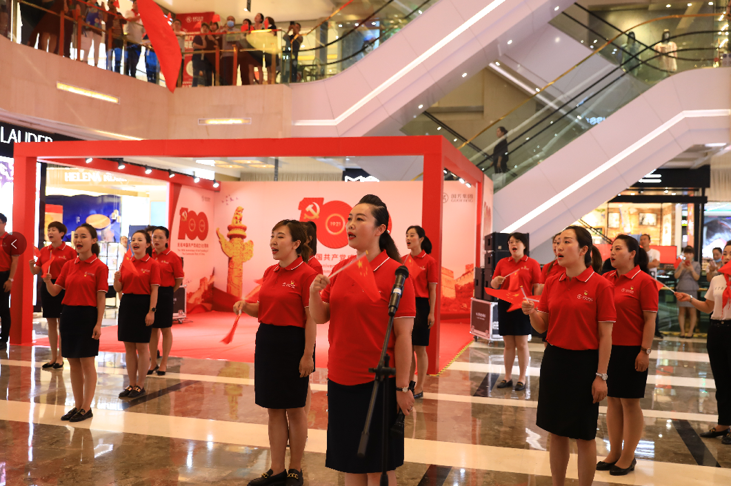 下午14時(shí),國芳集團慶祝中國共產(chǎn)黨成立100周年紅歌快閃活動(dòng)在蘭州國芳百貨廣場(chǎng)店一樓中廳隆重舉行。國芳集團全體黨員及員工代表參與其中,大家用歌聲表達對黨的無(wú)限忠誠和美好祝福。