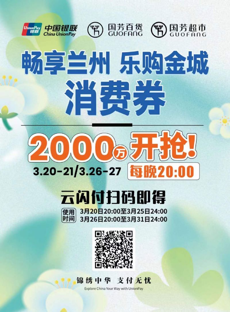 本次消費券具體發(fā)放時(shí)間為3月20日至3月31日,將分2個(gè)階段4個(gè)批次發(fā)放,分別為3月20日、3月21日、3月26日、3月27日的每晚20:00至24:00。消費券涵蓋國芳百貨、國芳超市以及國芳百貨內的餐飲場(chǎng)所等3個(gè)場(chǎng)景共計38萬(wàn)余張,消費范圍覆蓋美妝、服飾、餐飲及國芳超市等多品類(lèi)消費場(chǎng)景,旨在激發(fā)春季消費潛力,鞏固傳統消費,共同繁榮城關(guān)商貿經(jīng)濟,助推零售商業(yè)市場(chǎng)平穩發(fā)展。(廣大市民將通過(guò)“云閃付”APP領(lǐng)取并核銷(xiāo),具體活動(dòng)規則、適用范圍等信息可登錄“云閃付”APP查看。)