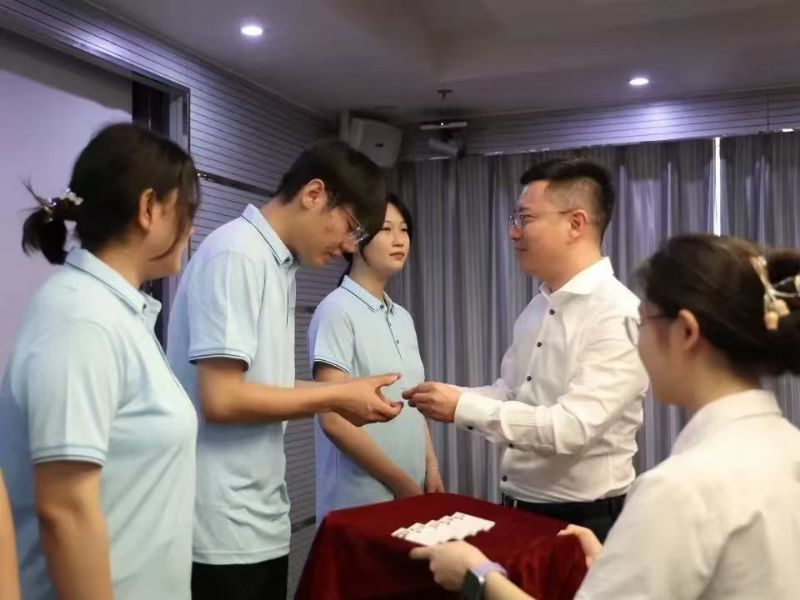 伴隨著(zhù)激昂的音樂(lè ),入職儀式進(jìn)入了發(fā)放工牌的環(huán)節。國芳集團各位領(lǐng)導面帶微笑,將蘊含著(zhù)公司信任與期望的工牌并伴手禮交到新員工手上,工牌在燈光的照耀下,折射出他們堅定的信念和對新征程的信心。