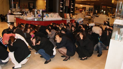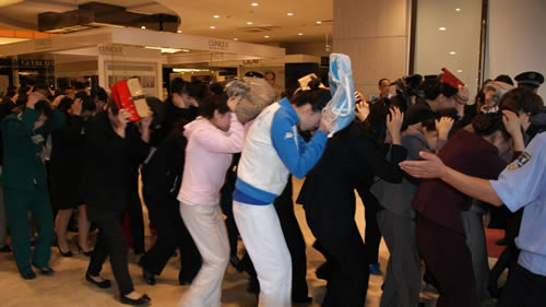國芳百貨員工按照防震緊急避險(xiǎn)的標(biāo)準(zhǔn)動(dòng)作進(jìn)行演習(xí)