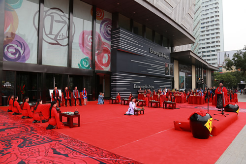 國芳集團(tuán)十七周年司慶大型文化活動(dòng)——漢式迎賓禮于9月3日上午8時(shí)30分,在國芳百貨正西門正式上演。除集團(tuán)各分子公司管理人員外,還邀請(qǐng)了與國芳集團(tuán)合作多年的數(shù)十名供應(yīng)商代表一同出席此活動(dòng)。