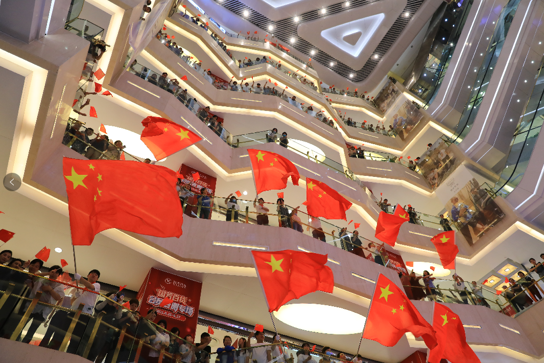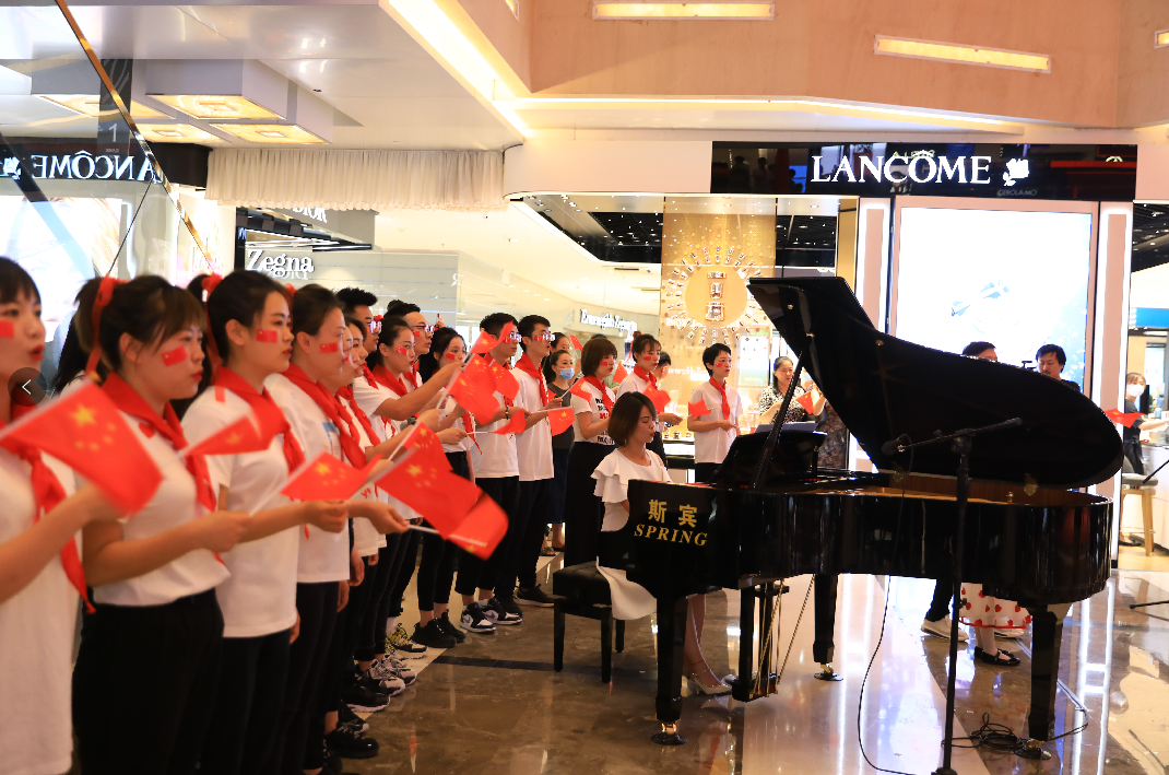 國芳百貨中廳,隨著鋼琴聲響起,活動(dòng)在男、女領(lǐng)唱“歌唱我們親愛的祖國,從此走上繁榮富強(qiáng)”的歌聲中拉開了活動(dòng)的序幕,30余名國芳集團(tuán)黨員及員工代表緩緩向主舞臺(tái)走來,大家手持國旗,組合成“100”字樣,神采奕奕,高聲齊唱。與此同時(shí),現(xiàn)場的圍觀顧客也紛紛加入到隊(duì)伍當(dāng)中,為演出錦上添花。