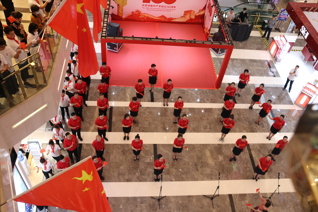 下午14時(shí),國芳集團(tuán)慶祝中國共產(chǎn)黨成立100周年紅歌快閃活動(dòng)在蘭州國芳百貨廣場店一樓中廳隆重舉行。國芳集團(tuán)全體黨員及員工代表參與其中,大家用歌聲表達(dá)對黨的無限忠誠和美好祝福。